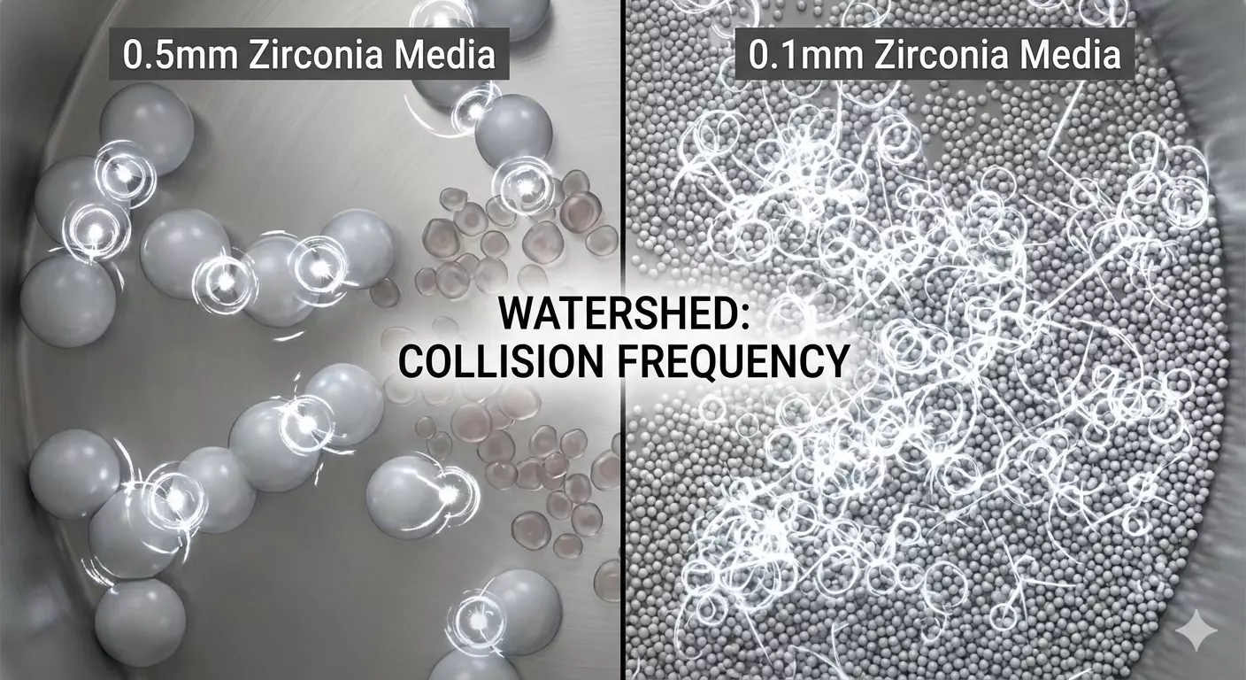 To grind particles down to the nanoscale, you need more than just power; you need collision frequency. The physics is simple: for the same volume of grinding chamber, using 0.1mm beads provides significantly more contact points than 0.5mm beads. This exponential increase in "grinding events" is what allows materials like high-end inkjet inks and electronic ceramics to reach a D90 of less than 100nm.